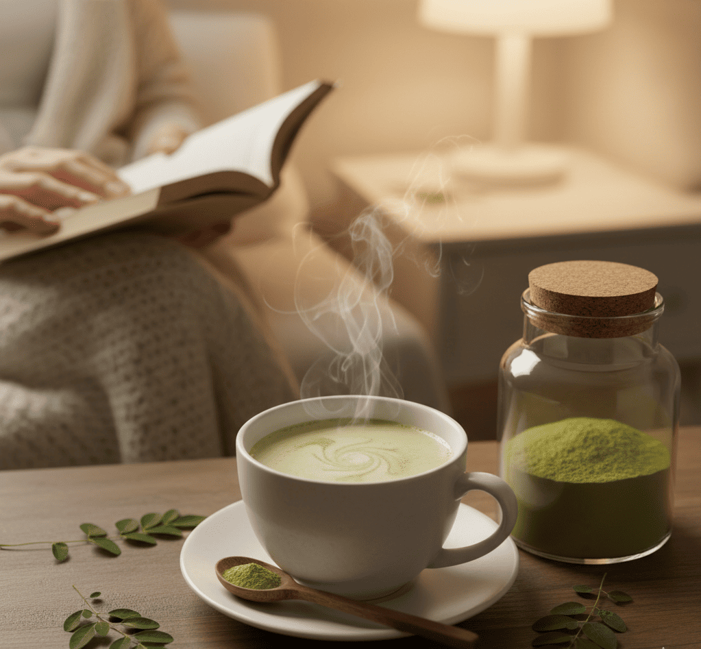 - Warm water + ½–1 tsp moringa